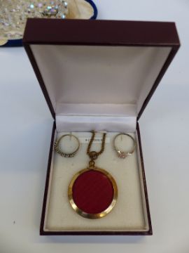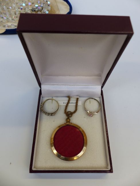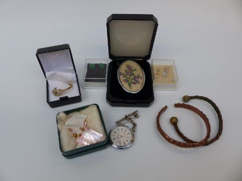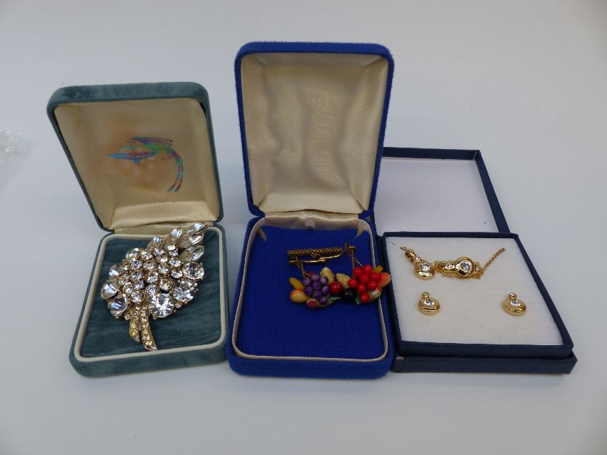 A collection of costume jewellery to include Mizpah brooch, diamanté etc