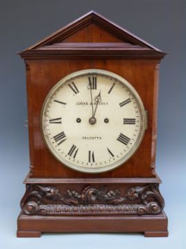 Cooke and Kelvey, Calcutta, Victorian twin fusee bracket clock in carved mahogany case with architectural top and painted white Roman dial with trefoil hands, the movement striking on a gong. 46cm tall