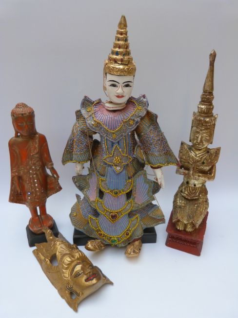 A collection of Thai and Indonesian items to include carved wood Buddhas, temple figure, puppet of a dancer, Indian doll and wooden masks of Indian deities