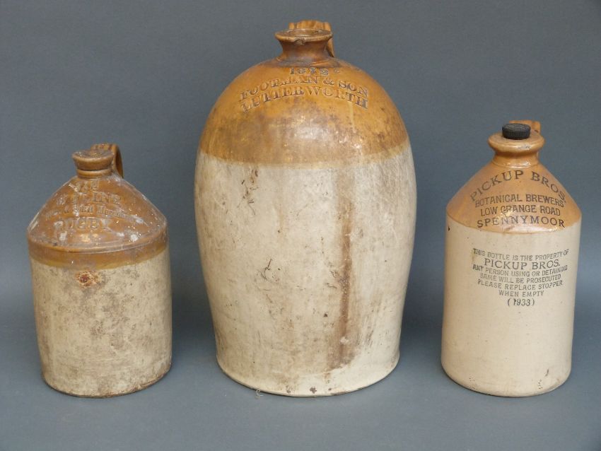 Three stoneware jars comprising Footman & Son, Lutterworth, W Flint, Rugby and Pickup Brothers, Spennymoor