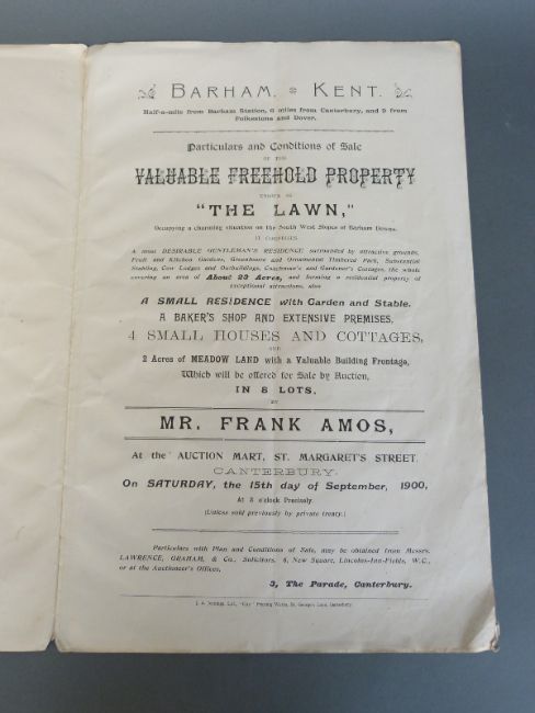 A Victorian auction catalogue relating to The Lawn, Barham, Kent by Frank Amos FSI, auctioneer, Canterbury, 15th September 1900, with maps and details of the eight lots