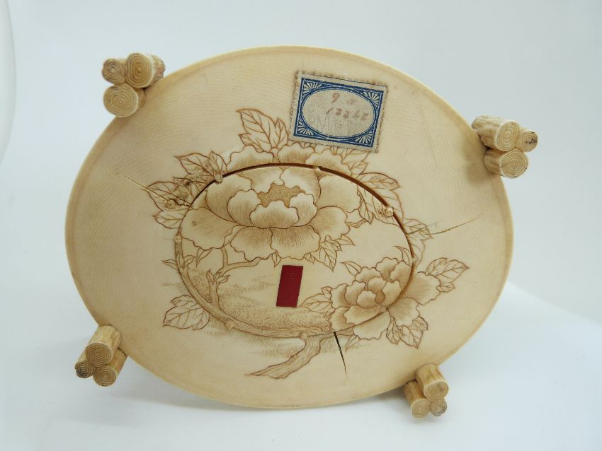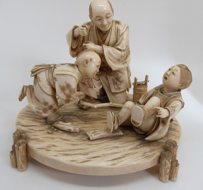 A late 19th / early 20thC Japanese ivory figural group depicting a father and two sons playing, with carved floral base and lacquer inset signature, old label to base, possibly Japanese School of Arts, 12 x 14 x 11.5cm