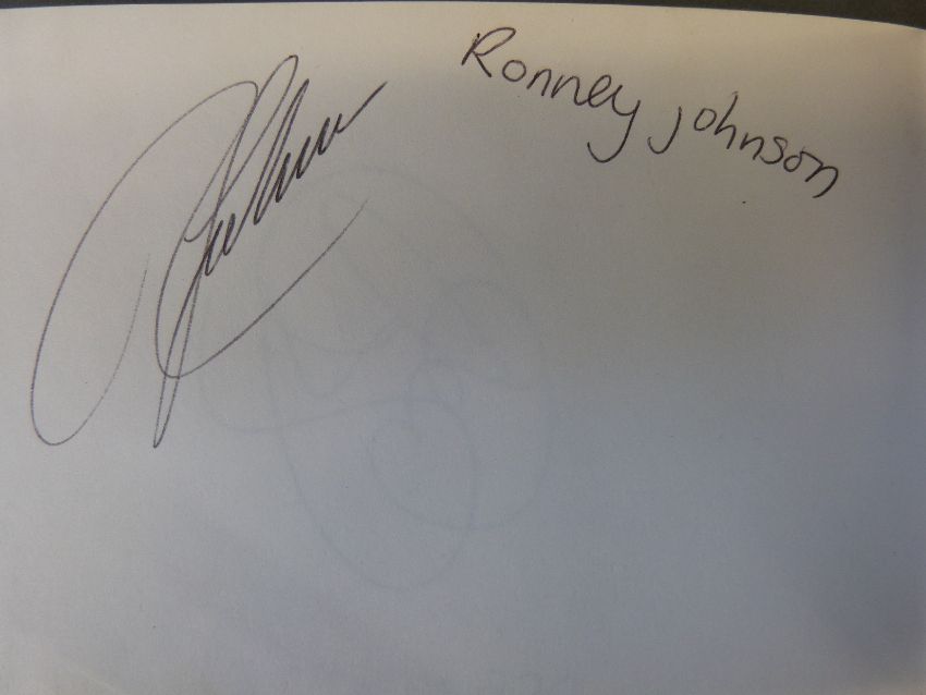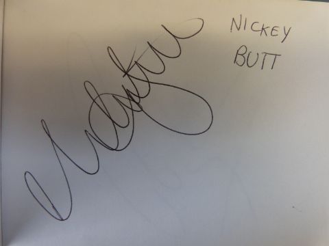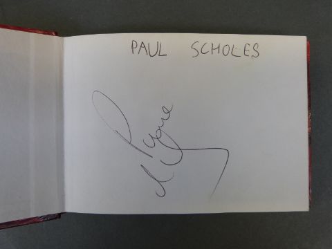 A collection of colour photographs of Manchester United players celebrating their win against Bayern Munich in the 1999 UEFA Champions League, including one of David Beckham embracing the captain Peter Schmeichel, together with Manchester United supporter's autograph album containing the signatures of Paul Scholes, Michael Clegg, Teddy Sheringham, Henning Berg, Ronny Johnson, Ole Gummar Solskjaer, Denis Irwin, Nicky Butt, Roy Keane, Andy Cole and Ryan Giggs and a separate framed signature of David Beckham (player's name written in capitals beside each signature by the young supporter)