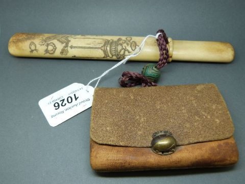 A Japanese bone pipe case with carved scene of a basket of fruit on a table and signature to one side, 22.5cm long, with an attached Japanese leather opium purse with bronze clasp and early glass bead decoration