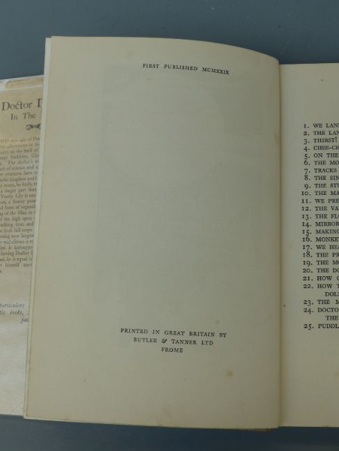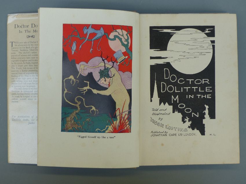 Hugh Lofting Doctor Dolittle In The Moon published Jonathan Cape 1929 first edition with 2 plates in colour and other illustrations, original cloth, in colour decorated dust wrapper