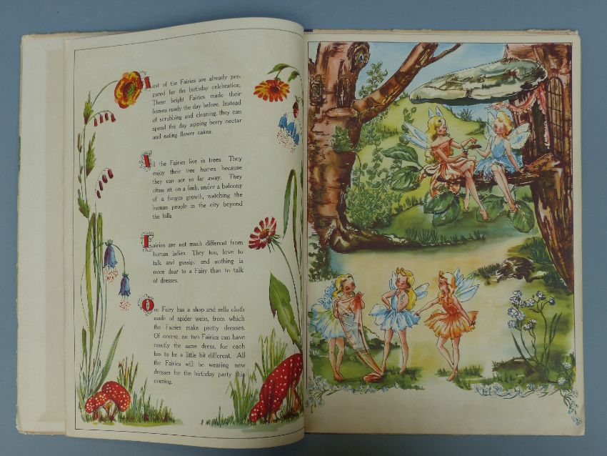 A Day in Fairy Land Story and Picture Book by Sigrid Rahmas and Ana Mae Seagren. No publisher (c1945) with full page colour illustrations, floral text decorations and coloured initials. Pictorial paper covered boards. Folio.
