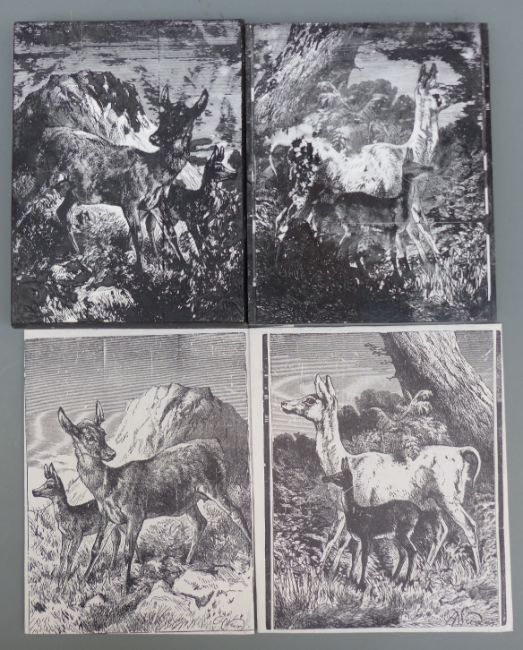 Harrison Weir two original wooden printing blocks with carved images of a deer and fawn within rural county settings. Signed by the artist in the block, believed to be intended for a book of Animals & Their Young pub'd in 1891, each 17cm x 14cm