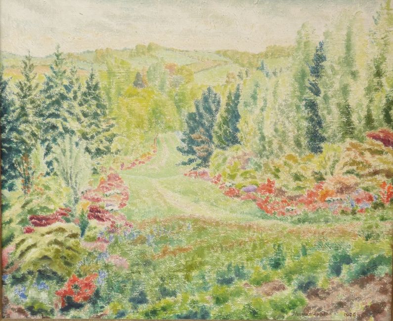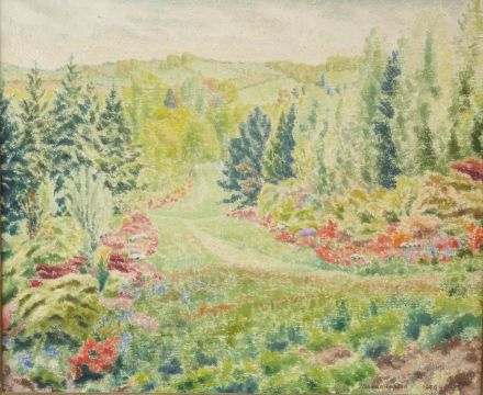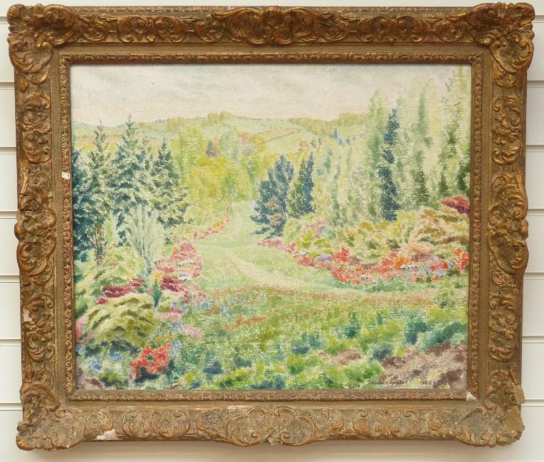 Norman Lupton oil on canvas 'The Carlotta Glade, Winkworth Farm, Hascombe, Surrey from beneath the Great Beech in the afternoon, mid May 1946 before the beds were widened', signed and dated bottom right, 50 x 60cm, in gilt frame