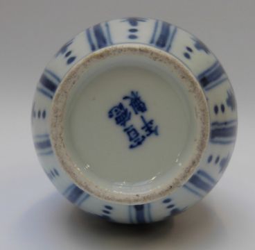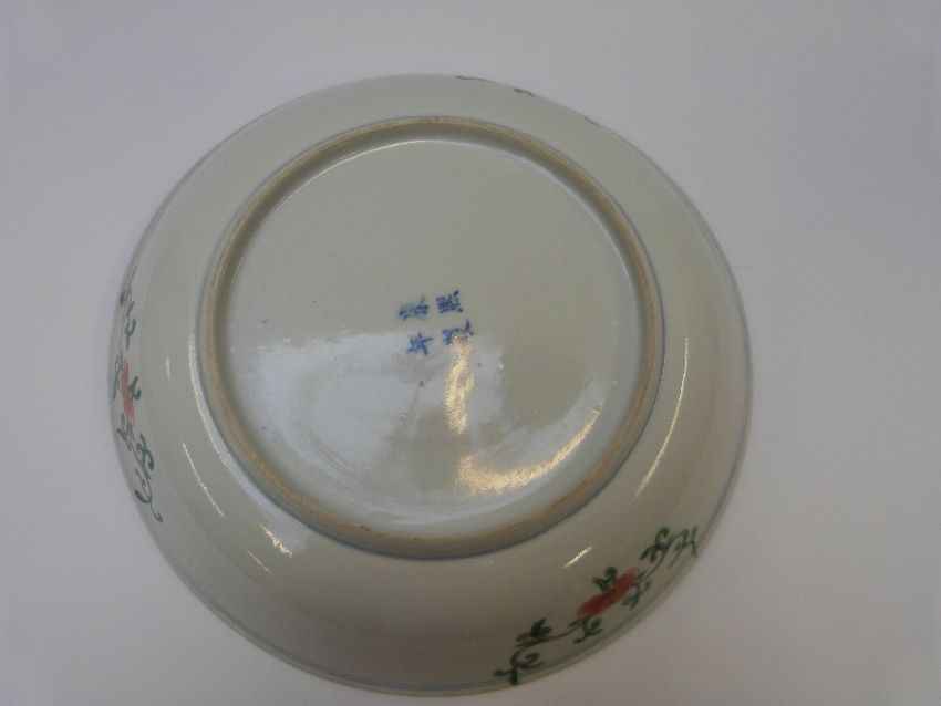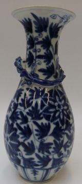 A Chinese blue and white vase with applied lizard to to the neck, 21cm tall and a Chinese shallow bowl with cartouches depicting court scenes, 24cm, both with four character marks to base