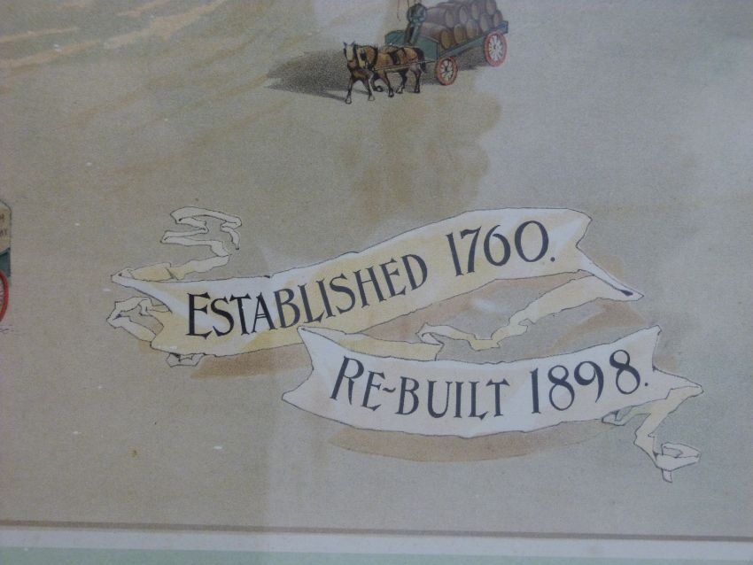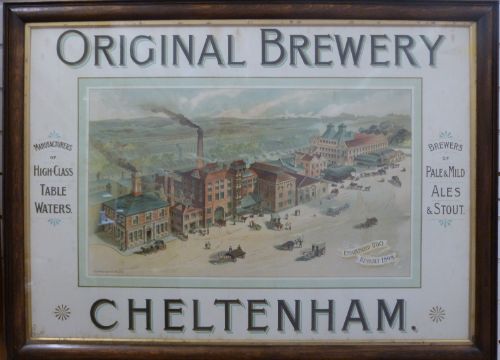 Original Brewery Cheltenham Victorian advertising print/sign in original large oak frame. Believed by the vendor, whose family were in the pub trade, to be one of five produced, one of which was in the Brewery offices, one in the The Wilson Museum, Cheltenham, 75 x 102cm