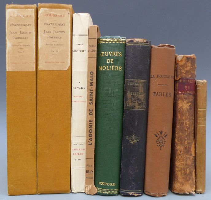 La Fontaine Fables 1896, Oeuvres de Moliere, Les Aventures de Telemaque by Fenelon Confessions of Jean Jacques Rousseau with etchings privately printed 1904 in 2 volumes, Nouveaux Ornemens ou Morceaux Choisis 1811 and others