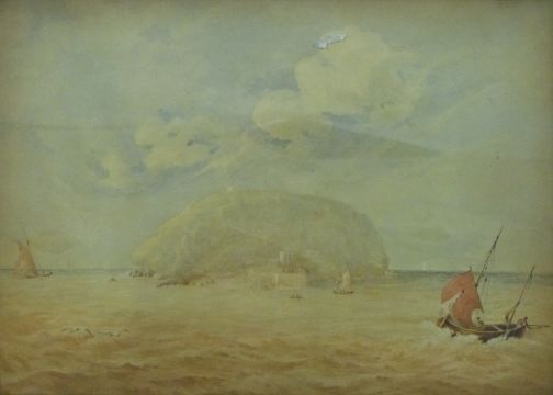 A 19thC watercolour of Steep Holm in the Bristol Channel with sailing boat to foreground, unsigned, but labelled verso with title and 'In the possession of Col Kemys Tynte M.P 1834' (M.P. for Bridgwater from 1832-37 who bought the island in 1833) approximately 33cm x 23.5cm