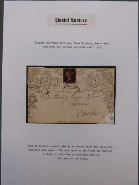 A well-researched and written up collection of Great Britain postal history mainly concentrating on Mulready covers. The collection includes a Penny Black plate 9 on cover, Mulready envelope with Penny Black, Whittakers Almanac envelope, unused two pence Mulready envelope, Deraedmaker essays stage 1 & 2, a range of illustrated envelopes including The Temperance Movement, Fores hunting envelope no 4, The Lord Holland Forgery one penny Mulready envelope, various caricature envelopes including Fores Christmas envelope no 10, Harry Furness design envelope, ocean penny envelope, Medeley envelope no 4 (rejected design) and many others. Also hand drawn and pre-post envelopes