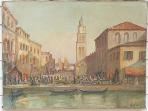 De C Paro oil on canvas Venetian scene with market by a canal, signed lower right, 60 x 80cm