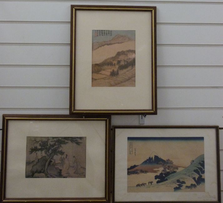A Japanese hand coloured print of Mount Fuji by Hokusai, 32 x 53cm, together with two prints.