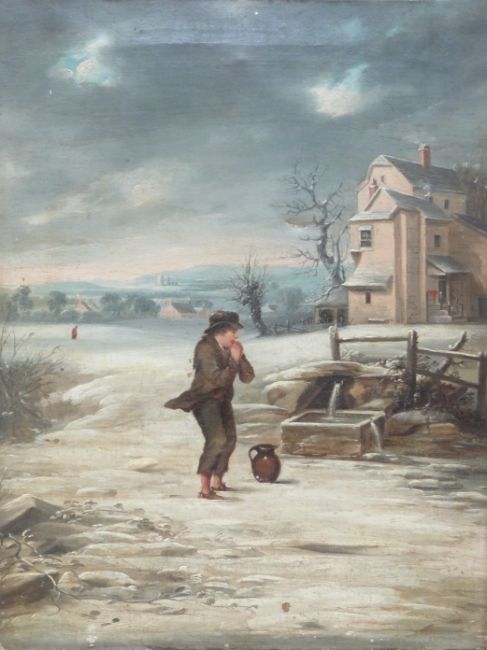 Oil on canvas of a boy in a snow covered landscape, 41 x 31cm