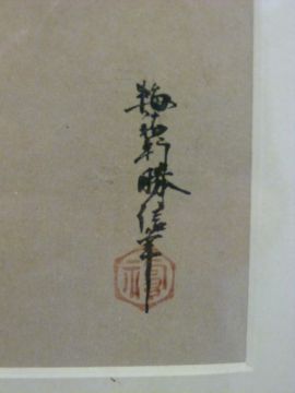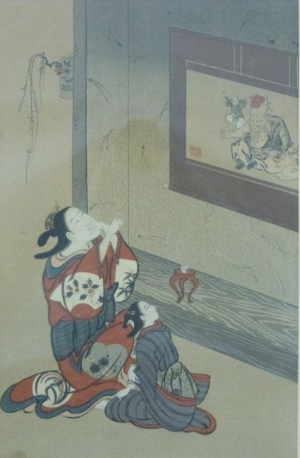 Two Japanese watercolours, one depicting a woman and child studying a scroll picture the other a man brushing a woman's hair, signed