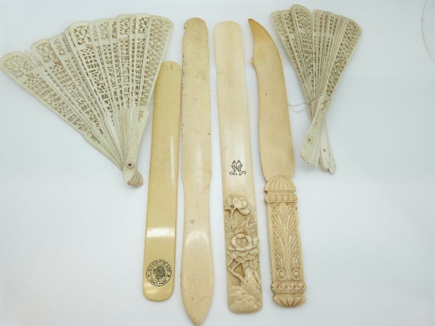 An early 20thC Japanese ivory page turner with carved floral decoration, verso engraved signature, two late 19thC ivory examples one modelled as a Saracen's sword, two pierced bone fans and further page turners