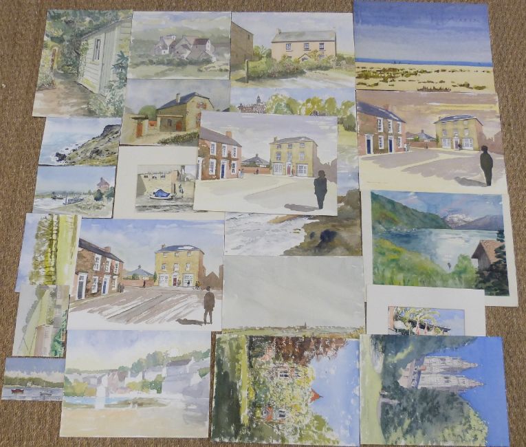 Approximately 20 mainly Malcolm Mitchell watercolours including coastal landscape, townscapes etc, largest 30 x 40cm