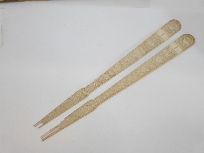 A 19thC Chinese Canton carved ivory fan depicting pagodas, flowers and birds, the two edges deeply carved with birds and flowers