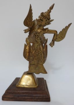 A pair of Indonesian or Thai brass figures of winged deities mounted on wood plinth bases, approximately 26cm high
