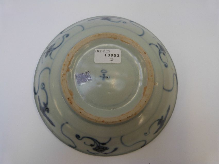 A Chinese blue and white dish from the Tek Sing cargo wreck of 1822, decorated with shaped panels enclosing lotus sprays, Nagel Auctions sticker to base, diameter 15.5cm