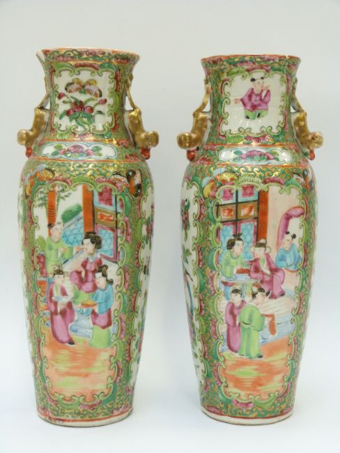 A pair of Chinese Cantonese famille rose vases depicting court scenes, 25cm tall