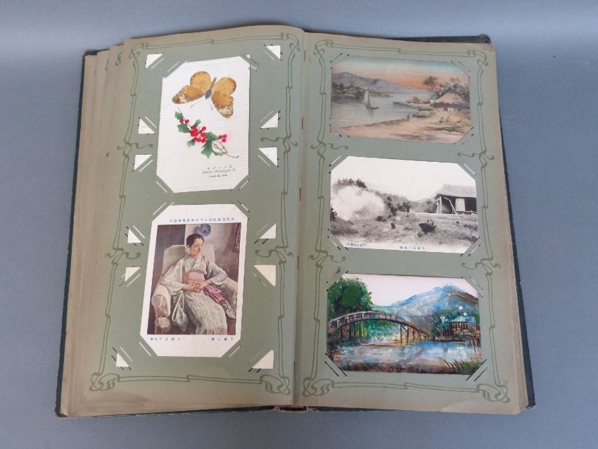 An Edwardian era postcard album with approximately 115 Japanese cards including a good percentage of hand-decorated examples