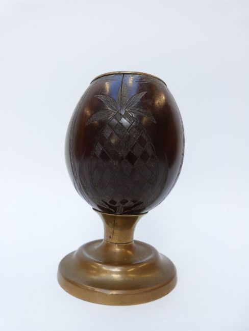 A 19thC carved coconut cup with brass mounts and carved gourd