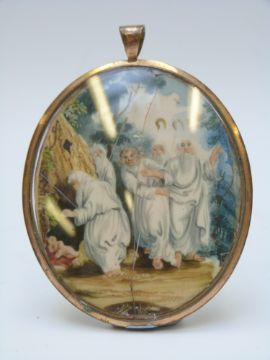 A 19thC Druid interest double sided portrait miniature on ivory, one side with portrait of a man in white headdress and marked 'Presented by Lodge 50, Dec 1819 to Past Arch Fox', verso a scene of men in white robes finding a baby in a cave, maximum diameter 7.5cm
