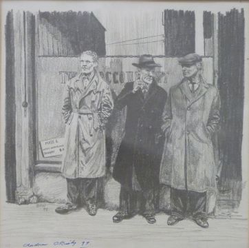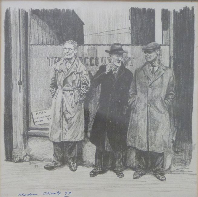 Pencil drawing of three figures in front of a shop, indistinctly signed and dated lower left, possibly Andrew O'Reily, 97, 22cm x 22cm