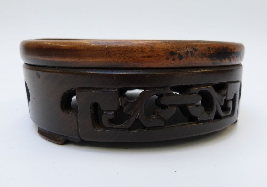 A glass dome, 25cm tall, on ornately carved hardwood base together with three similar bases