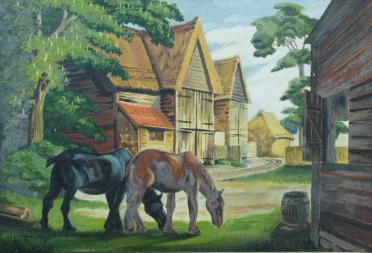 Stan Cotterell acrylic on board horses grazing in a farmyard, 49 x 72cm