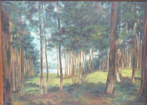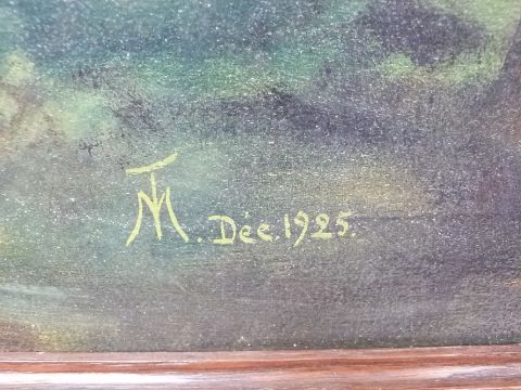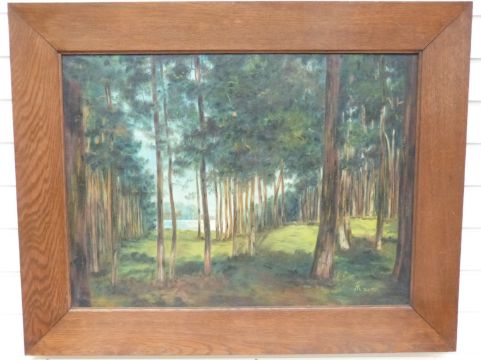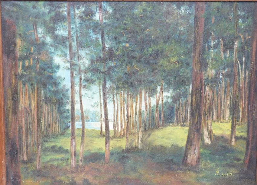 Oil on canvas woodland scene with lake visible through the trees, monogrammed and dated T M Dec 1925 lower right, 57 x 78cm, in oak or similar frame