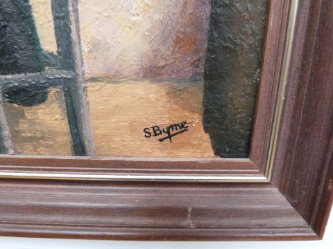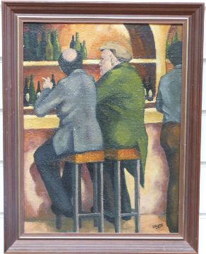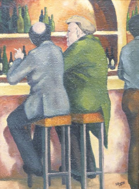 S Byrne oil on board of two men talking at a bar, signed lower right, in the manner of Norman Cornish, 39cm x 29cm