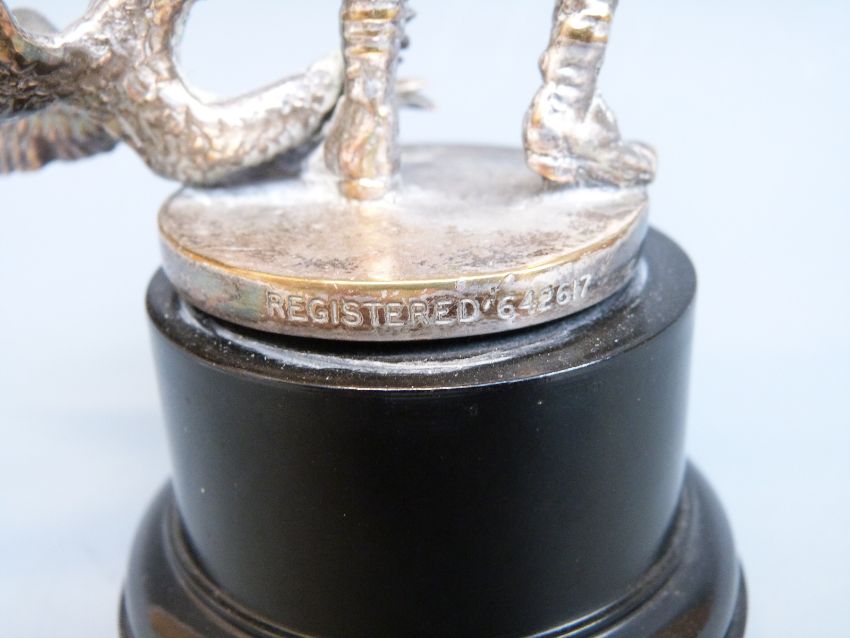 A car mascot formed as a British WWI soldier pointing a rifle at an eagle wearing a Pickelhaube helmet, marked to base Registered 642617, height including base 14.5cm