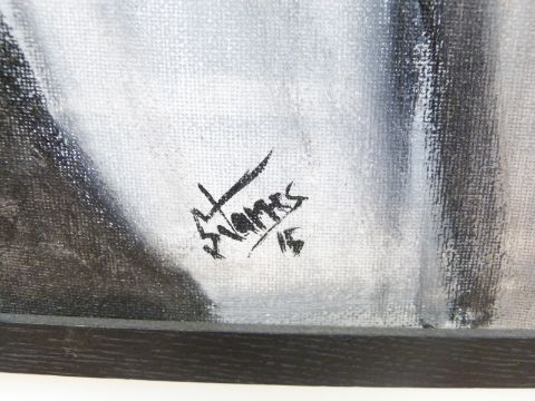 S James oil on canvas portrait of four men possibly the Beatles, signed and dated 15 lower left, 50cm x 39cm