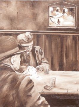 In the manner of Norman Cornish oil on canvas of two men playing cards in a pub, monogrammed ACL lower right, 40cm x 30cm