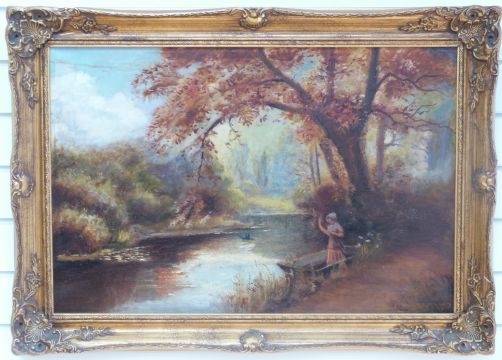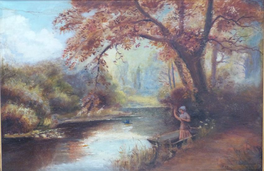 Oil on canvas of girl in a punt, indistinctly signed lower right 49 x 75cm, in gilt frame