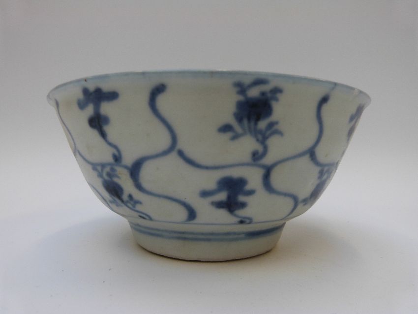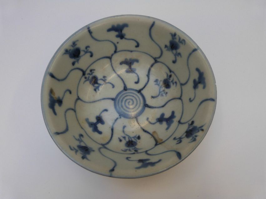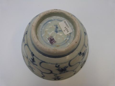 A Chinese blue and white bowl and another similar shallow bowl, both from the Tek Sing cargo wreck with Nagel Auctions stickers to bases