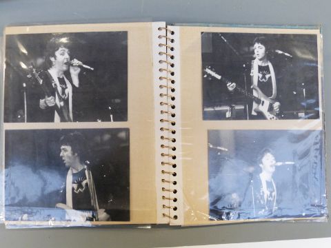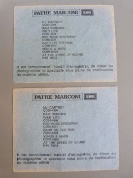 Paul McCartney signed postcard with a collection of Wings and Paul McCartney ephemera, including candid photos of the McCartneys and Wings concert ticket stubs dated 1976 for the Pavillion de Paris