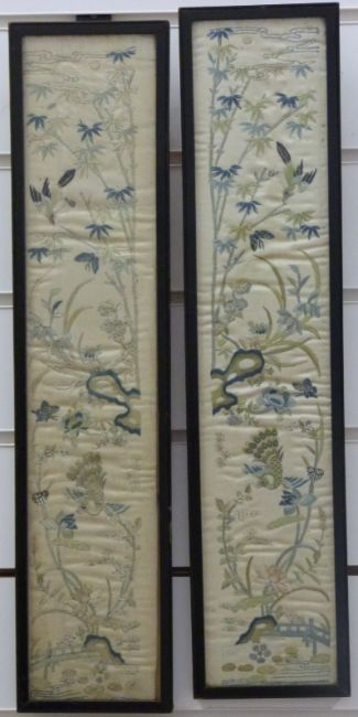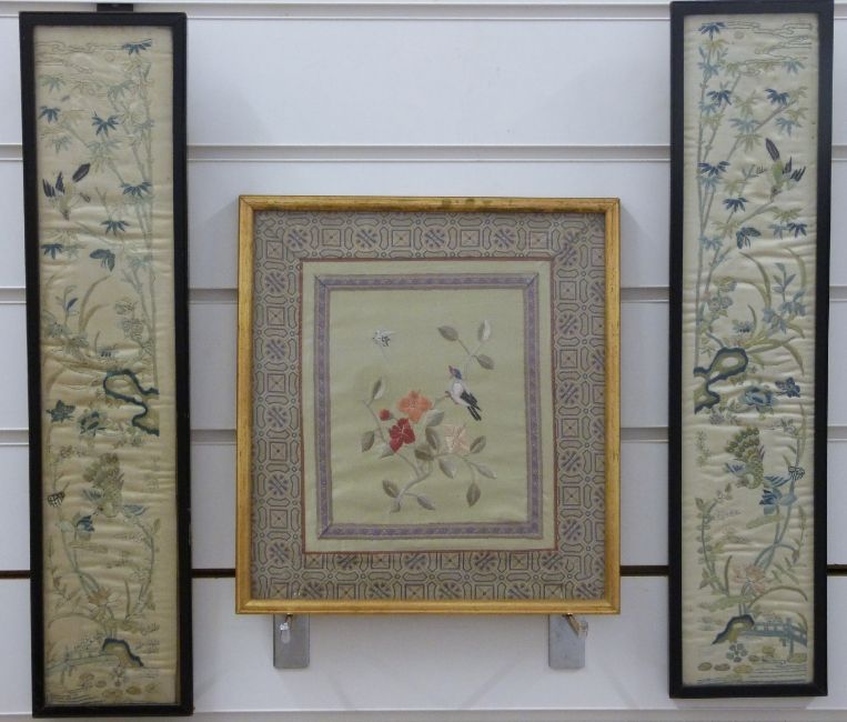 A pair of Chinese framed silk cuffs in blue stitching and a further silk embroidery depicting birds and hares