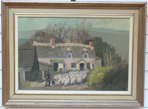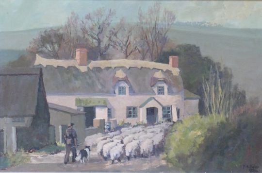 Freddie Baker 'Sheep at Chidgley', sheep being driven down a road beside a thatched cottage, signed and dated 1986 lower right, 40cm x 59cm