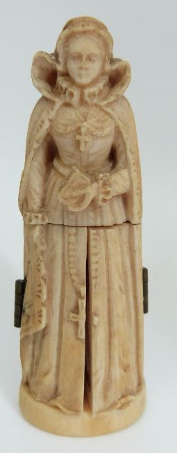 A 19thC Dieppe ivory figure of Mary Queen of Scots, opening to reveal carved court scenes, 8.5cm