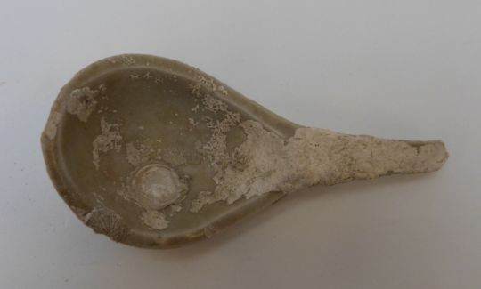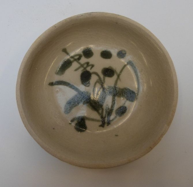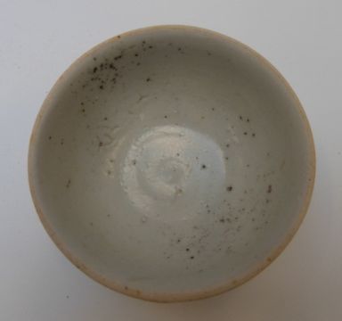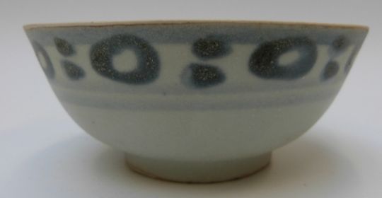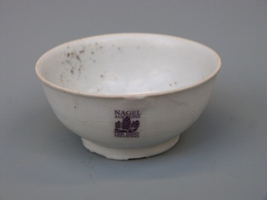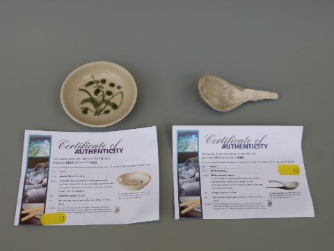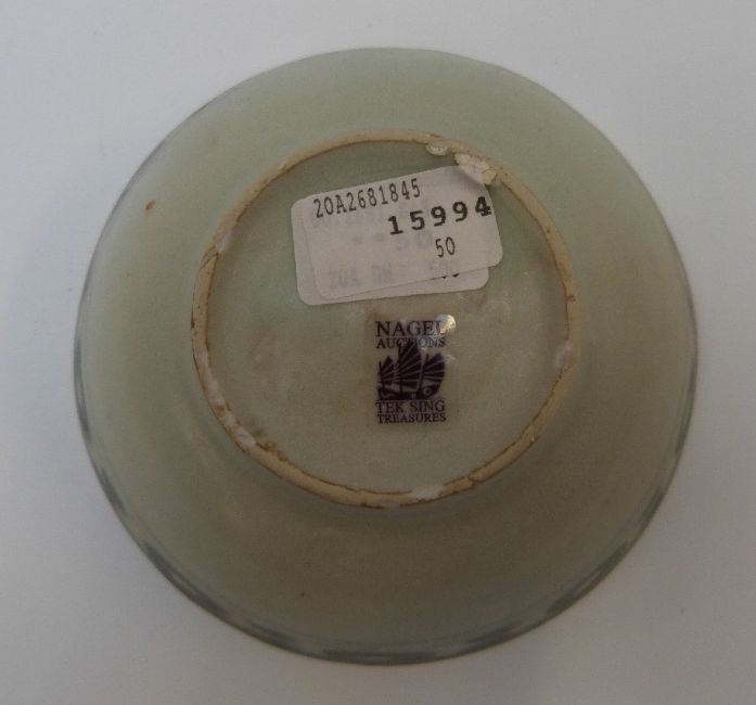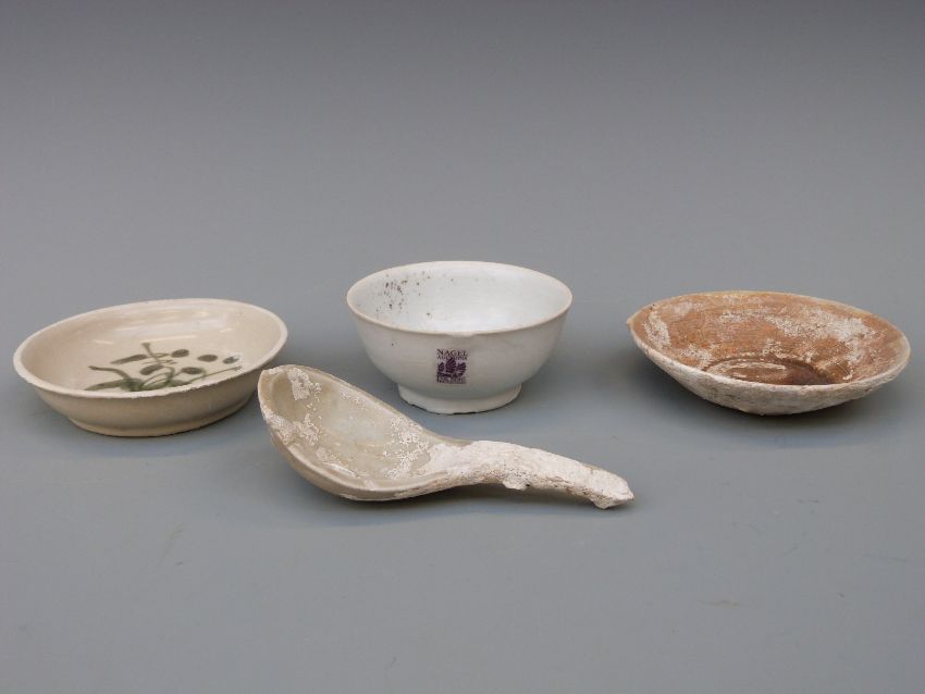 A Chinese blue and white dish, decorated in the central well pattern, with Nagel Auctions sticker to base (8.5cm diameter), a Chinese bowl in pale celadon glaze and a Chinese porcelain spoon, length 11.5cm, all from the Tek Sing cargo wreck of 1822 together with a further dish and a Chinese blue and white bowl from the Tek Sing cargo wreck in circle and ring pattern, circa 1800 with Nagel Auctions sticker to base.