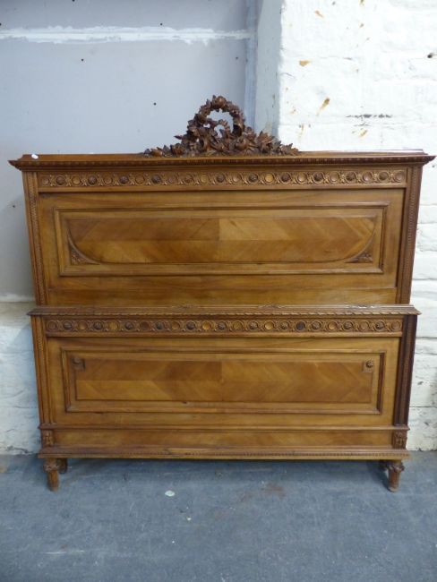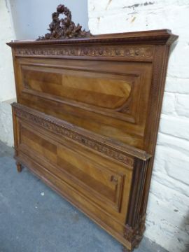 A French walnut bed with carved decoration comprising headboard, tailboard and side rails with slats attached, W160 x L206cm (would suit king sized mattress)