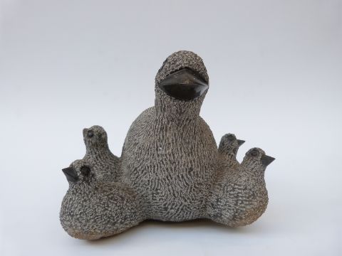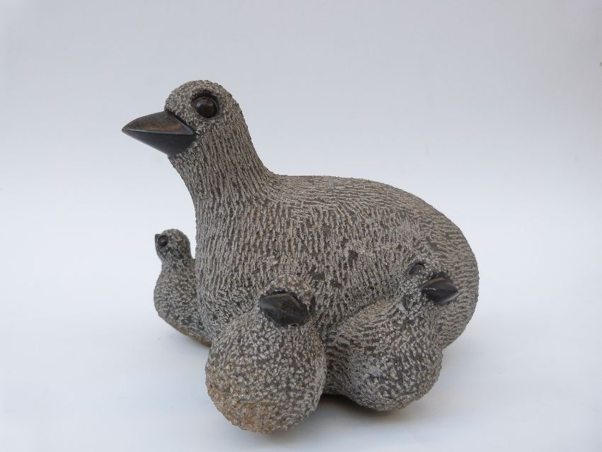 An African Shona green stone carving of a bird with chicks, signed S Onoha, approximately 18.5cm tall