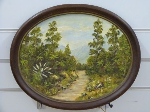 T M Murtrie pair of oval oil landscapes of Coromandel, New Zealand, max diameter 36cm