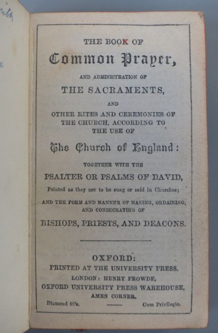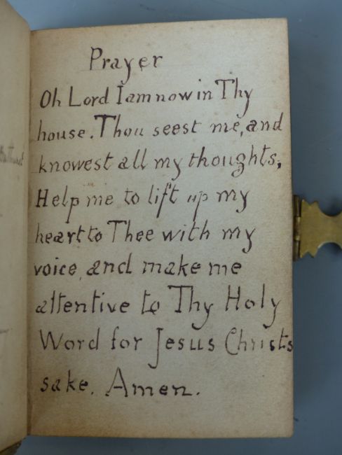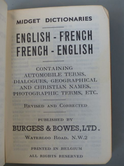 [Miniatures] Old Thumb Bible leather in slipcase, Book of Common Prayer 1860 metal edged binding with clasp, 2 volume set in gilt decorated leather 1901 Plain Texts quotations and Midget dictionaries