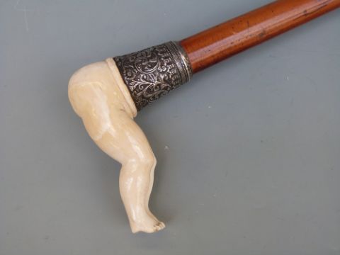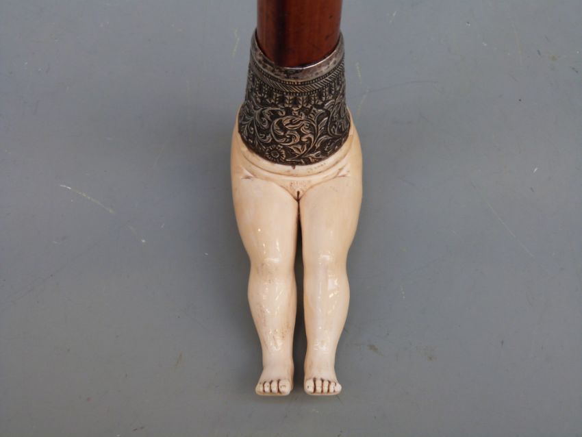 An Indian malacca walking stick with carved ivory handle depicting a woman's naked legs and bottom, with white metal collar